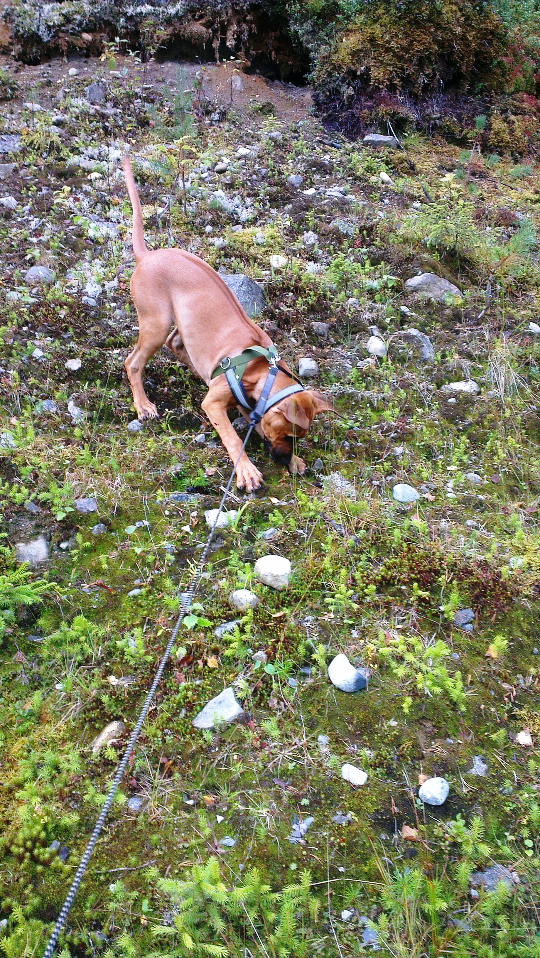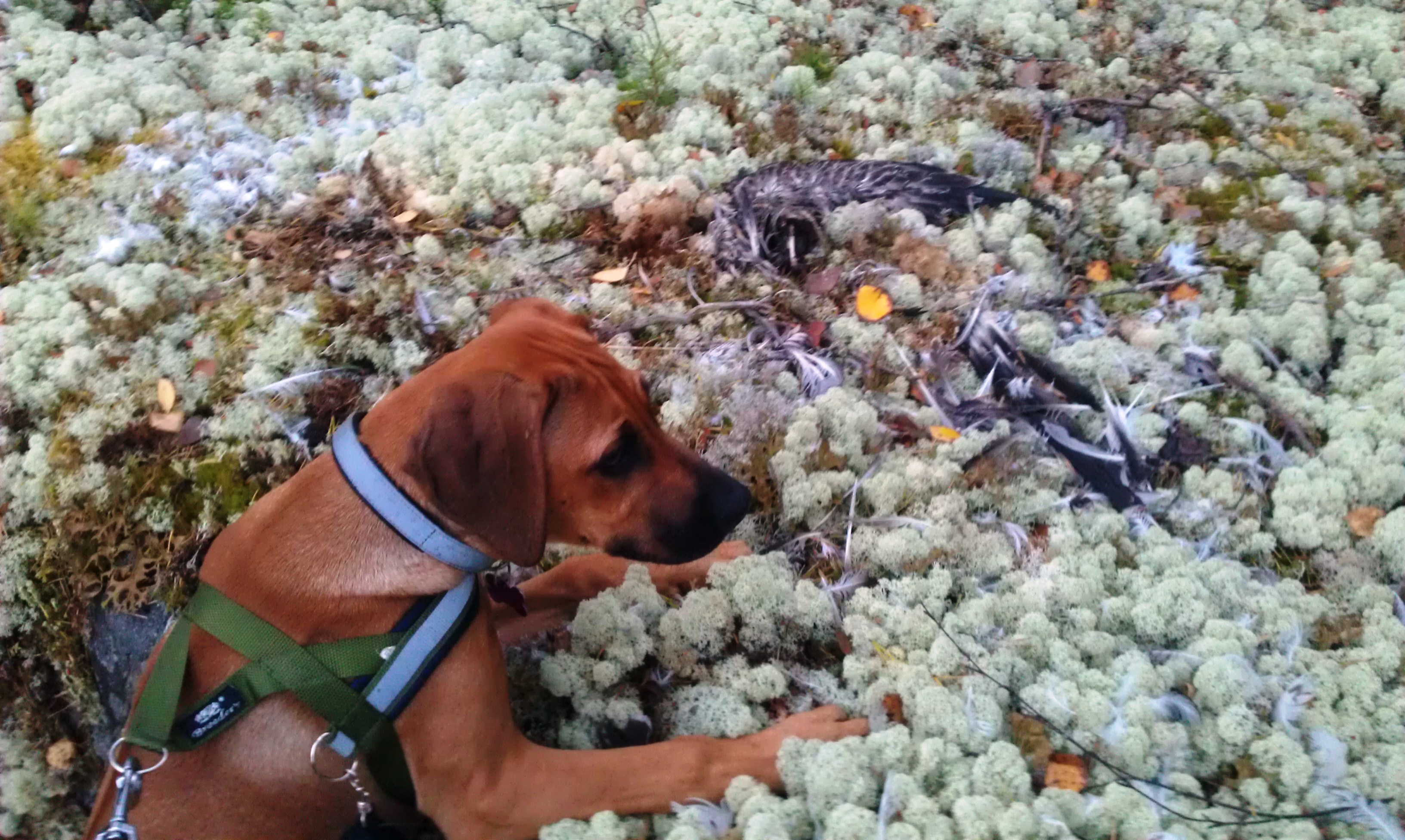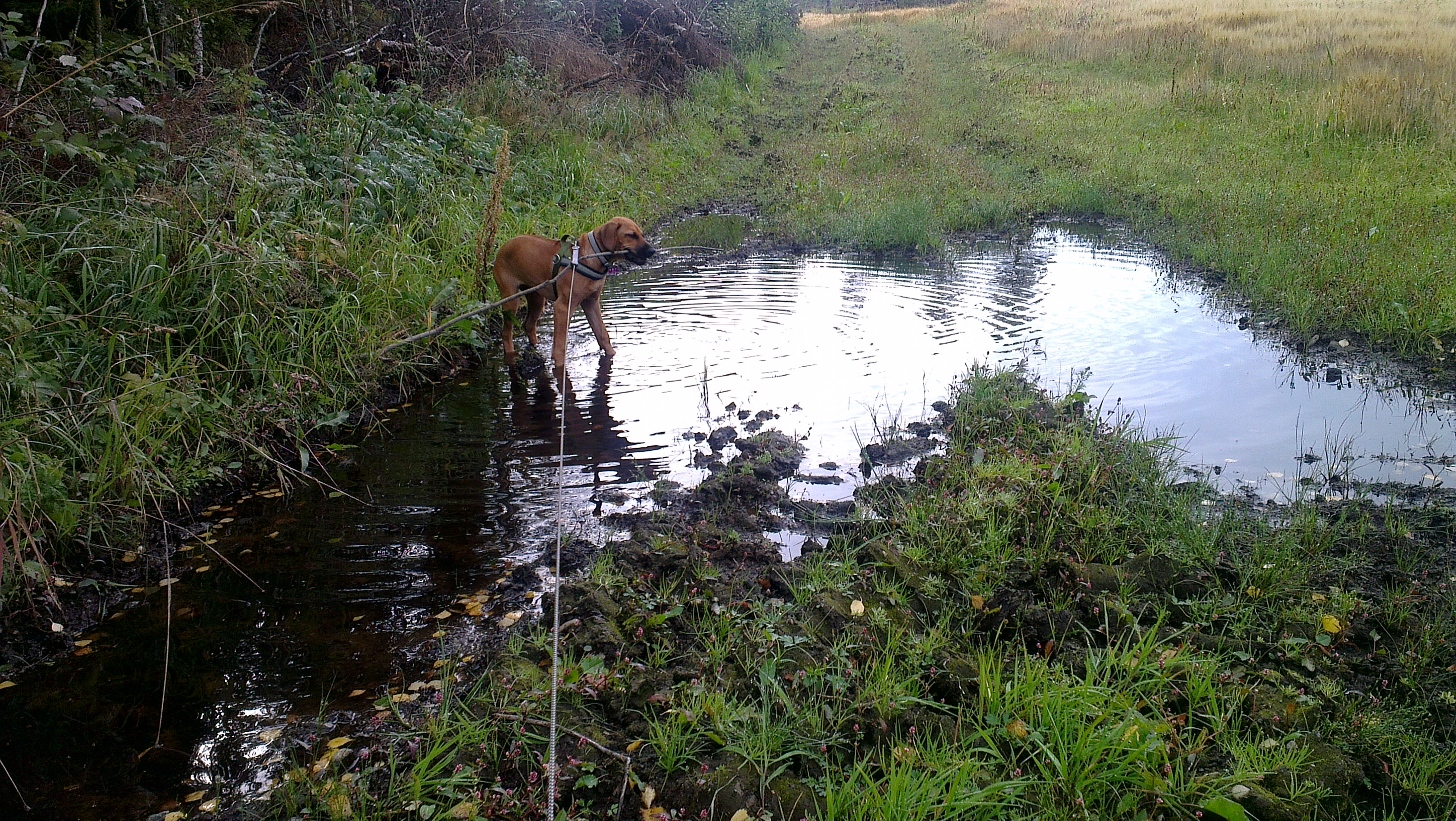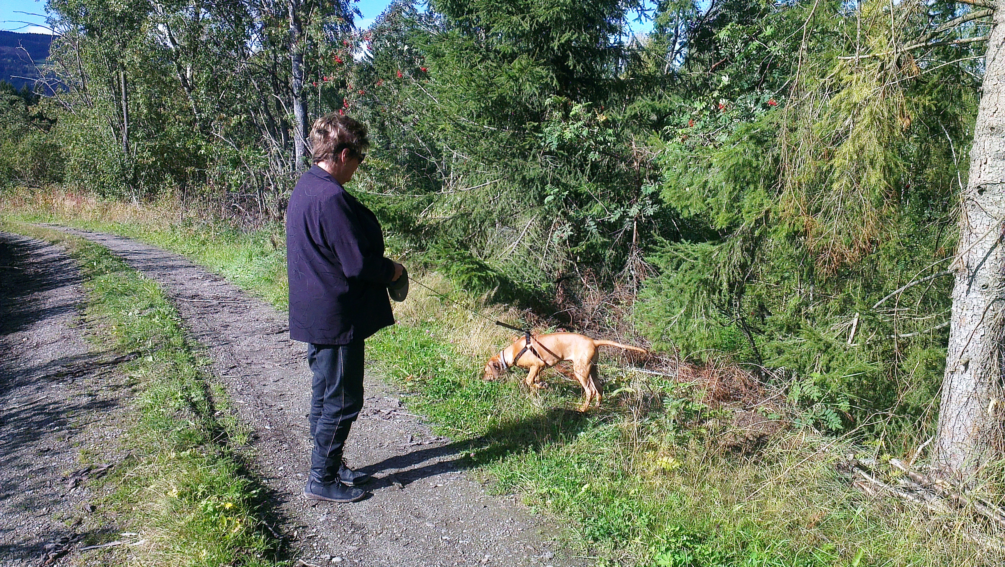 Ellers har vi funnet en fin vei i skogen hvor de vanligvis trener travhester. Og bortsett fra at de megastore dyrene skremmer vettet av meg hver gang de kommer (jeg later som jeg er tøff, altså, og bjeffer og knurrer slik at de ikke kommer for nære) er det rett og slett helt herlig. Matmor har blitt supermodig og har lovet meg at bare båndtvangen er over, og alle sauer og kuer er tilbake på gårdene sine, så skal jeg få løpe løs uten bånd. Gleeeeder meg!! Det er også noe helt vidunderlig masse spennende å oppdage der ute. Jeg er en skogshund, jeg 🙂