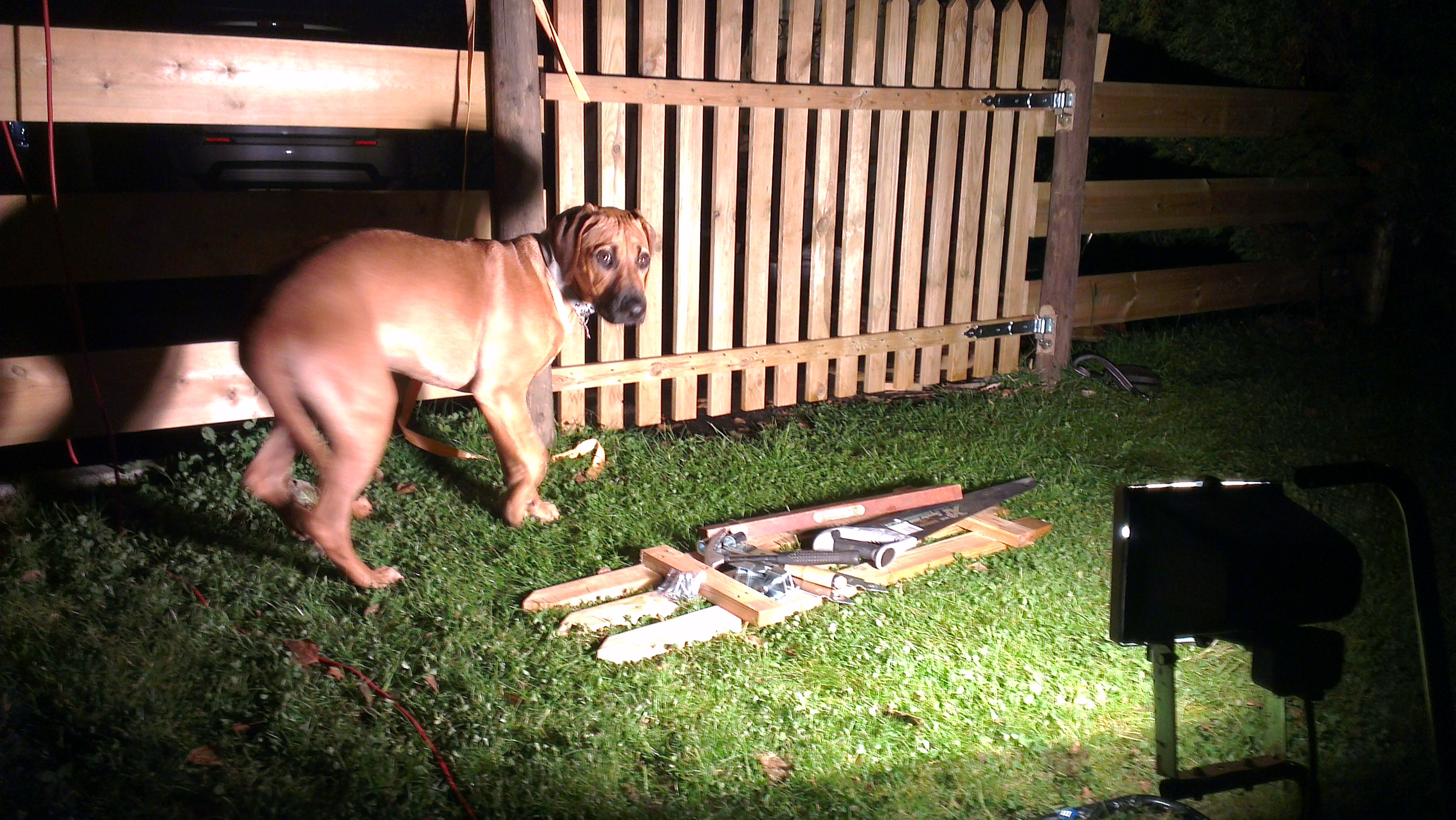 September har vært en koselig måned. Jeg har blitt kjent med Eir, ei kjempesøt Rottweilerjente på valpekurset mitt og vi leker masse sammen hver mandag kveld. Og så besøkte vi Linn på Hamar. Hun har ikke Ridgeback lenger, men siden matmor kjenner henne og det var hun som er hovedårsaken til at matmor oppdaget Ridgeback-rasen ble jeg kjent med hysterisk raske Yatzy… en pincher… Hun var kjapp, hun!! Nå har matfar Øivind endelig laget port til meg, i gjerdet, også, så nå mangler det bare litt høyere gjerde mot den pysete Boarder Collien… men det blir til sommeren igjen. Jeg kvalitetssikret arbeidet… Porten er perfekt!