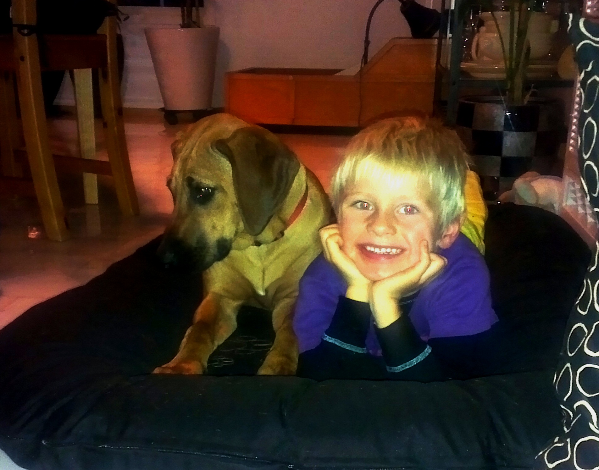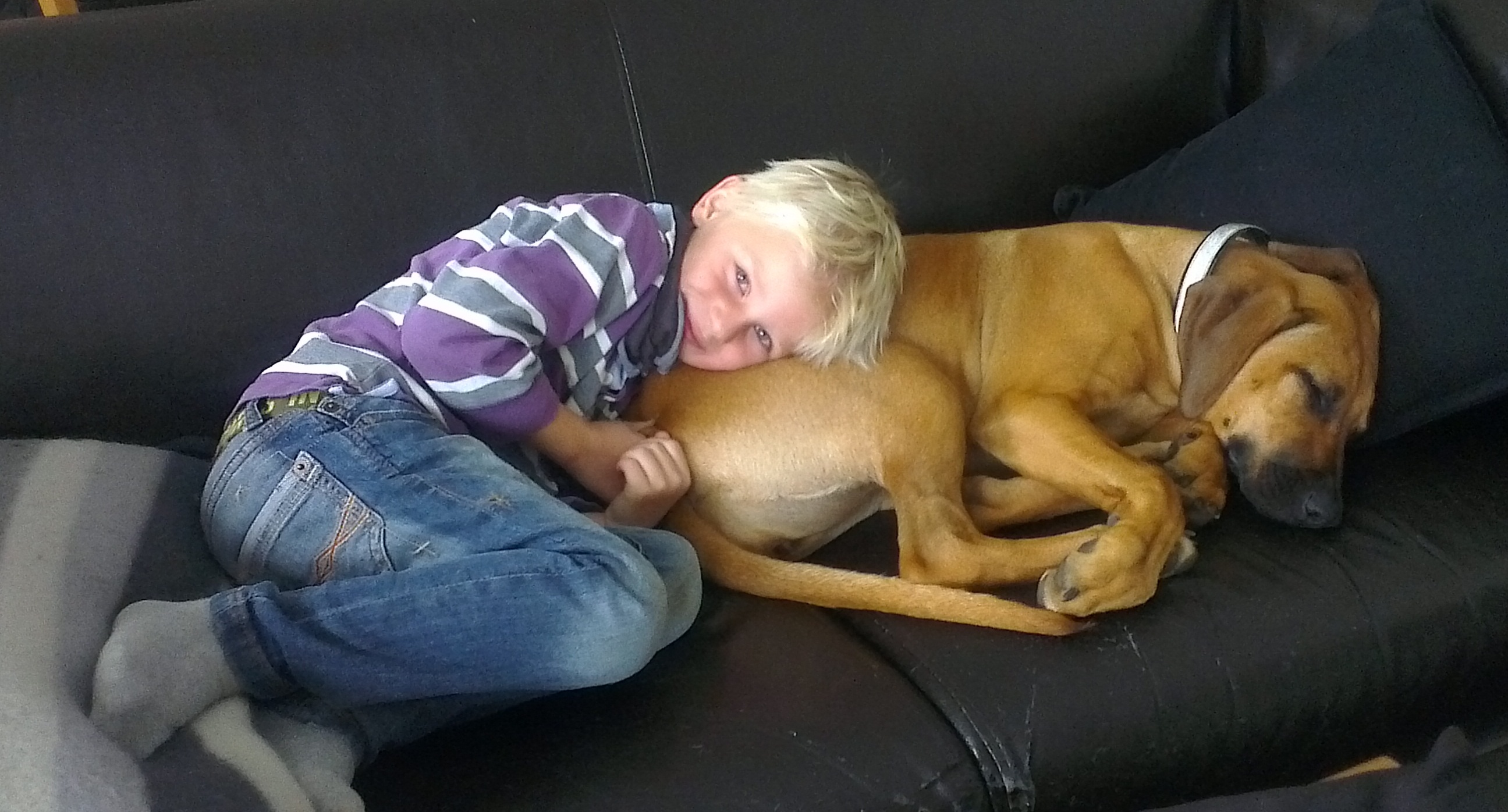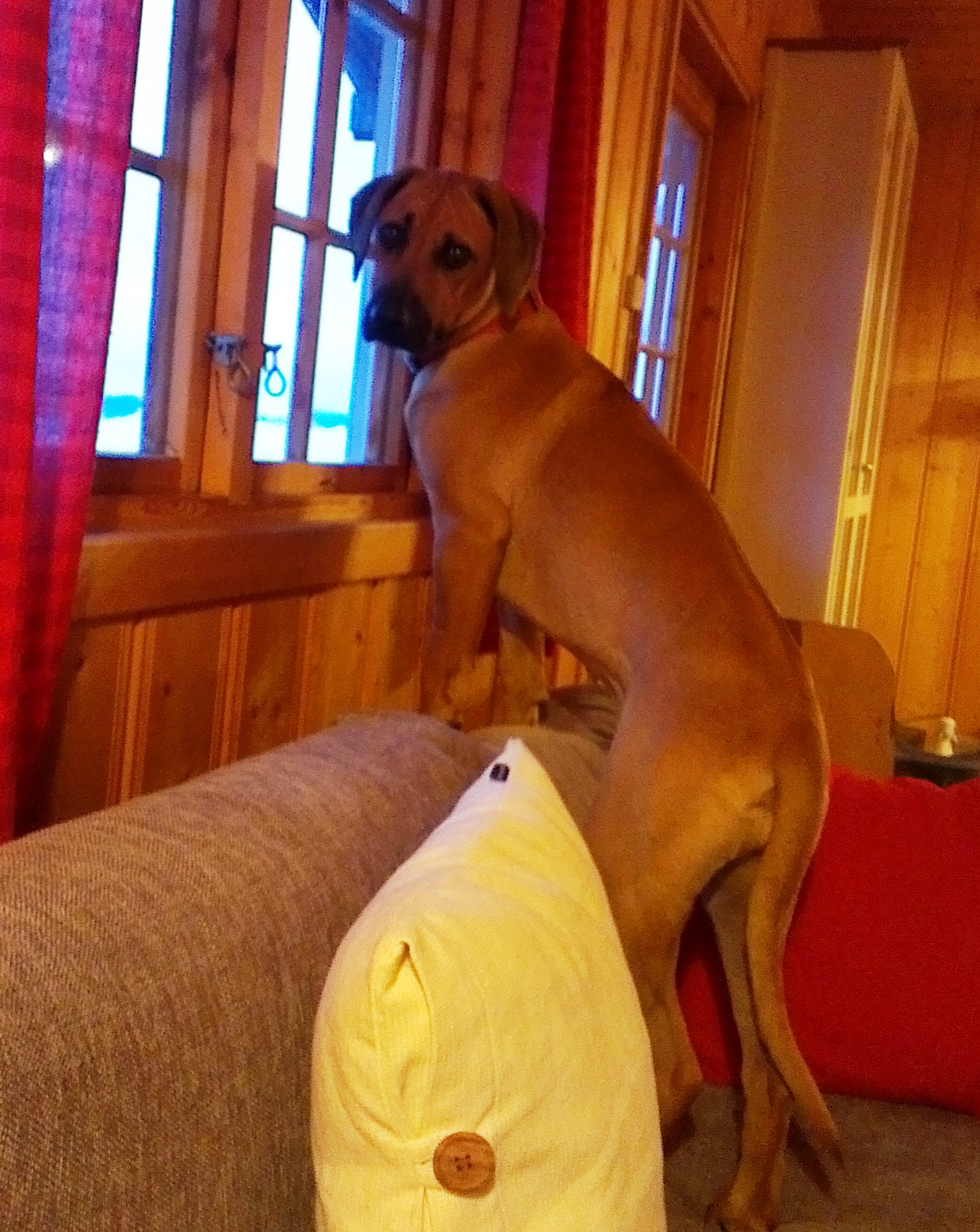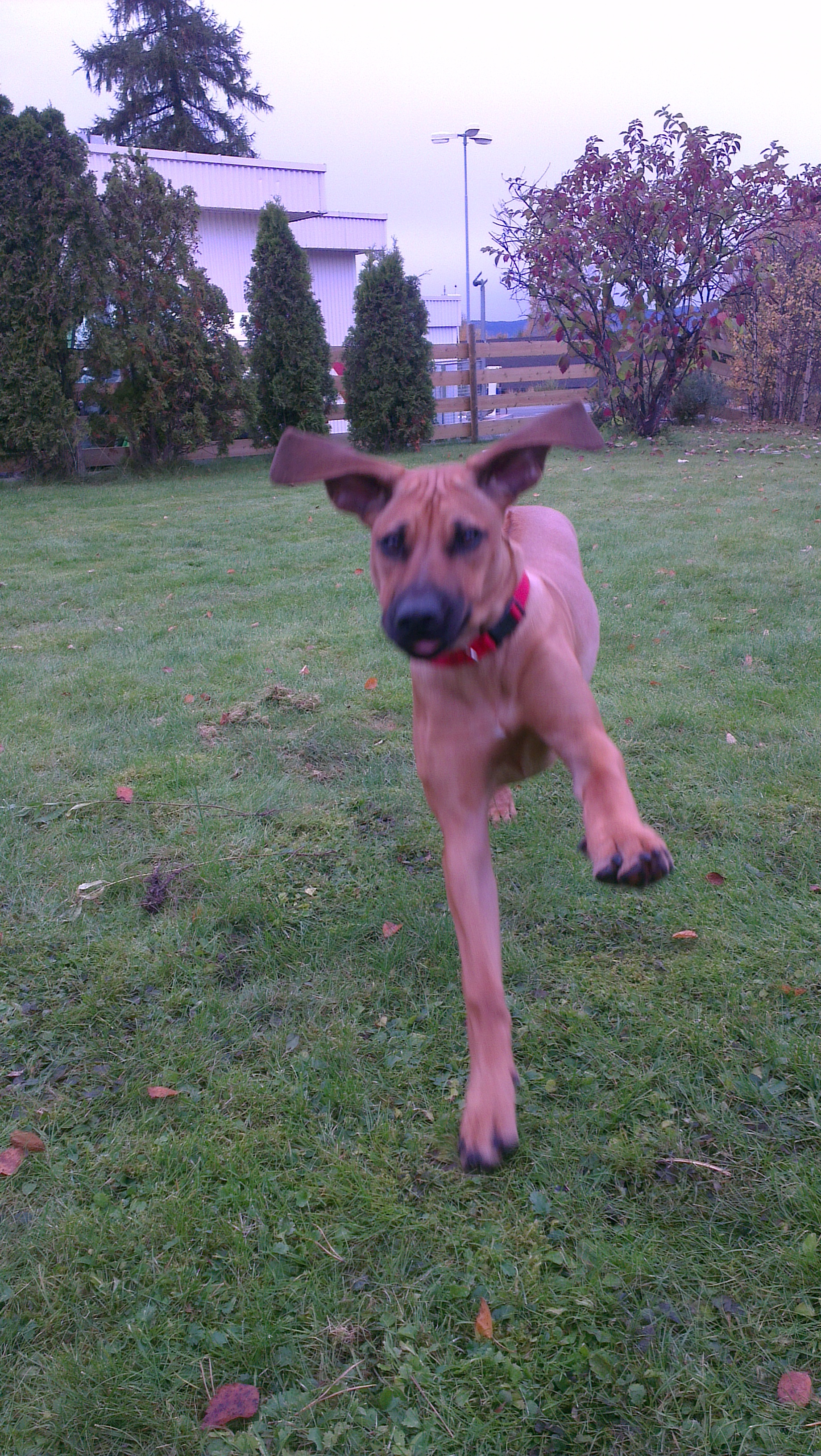 Matmor begynte på ny jobb, så jeg fikk bli med dit for å bli kjent med området, liksom. Og der traff jeg noe rart … de kalte det en katt. Den hadde nesten samme farge som meg, men var mye flinkere enn meg til å klatre… (og ingen må tro jeg ikke har prøvd!). Og så er vi av og til i en hundehage og leker med andre hunder. Det er skikkelig fint å ha noe fornuftig å bruke all den energien jeg lader opp til i sofaen. Men jeg blir helt utslitt og må lade litt ekstra når jeg kommer hjem.