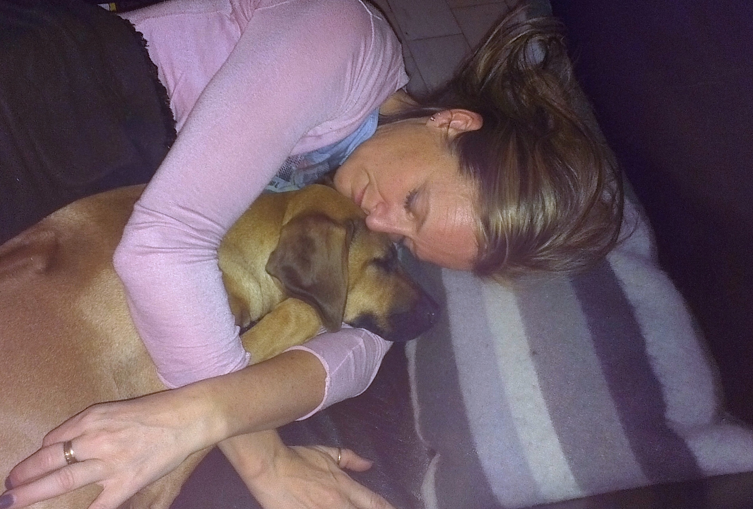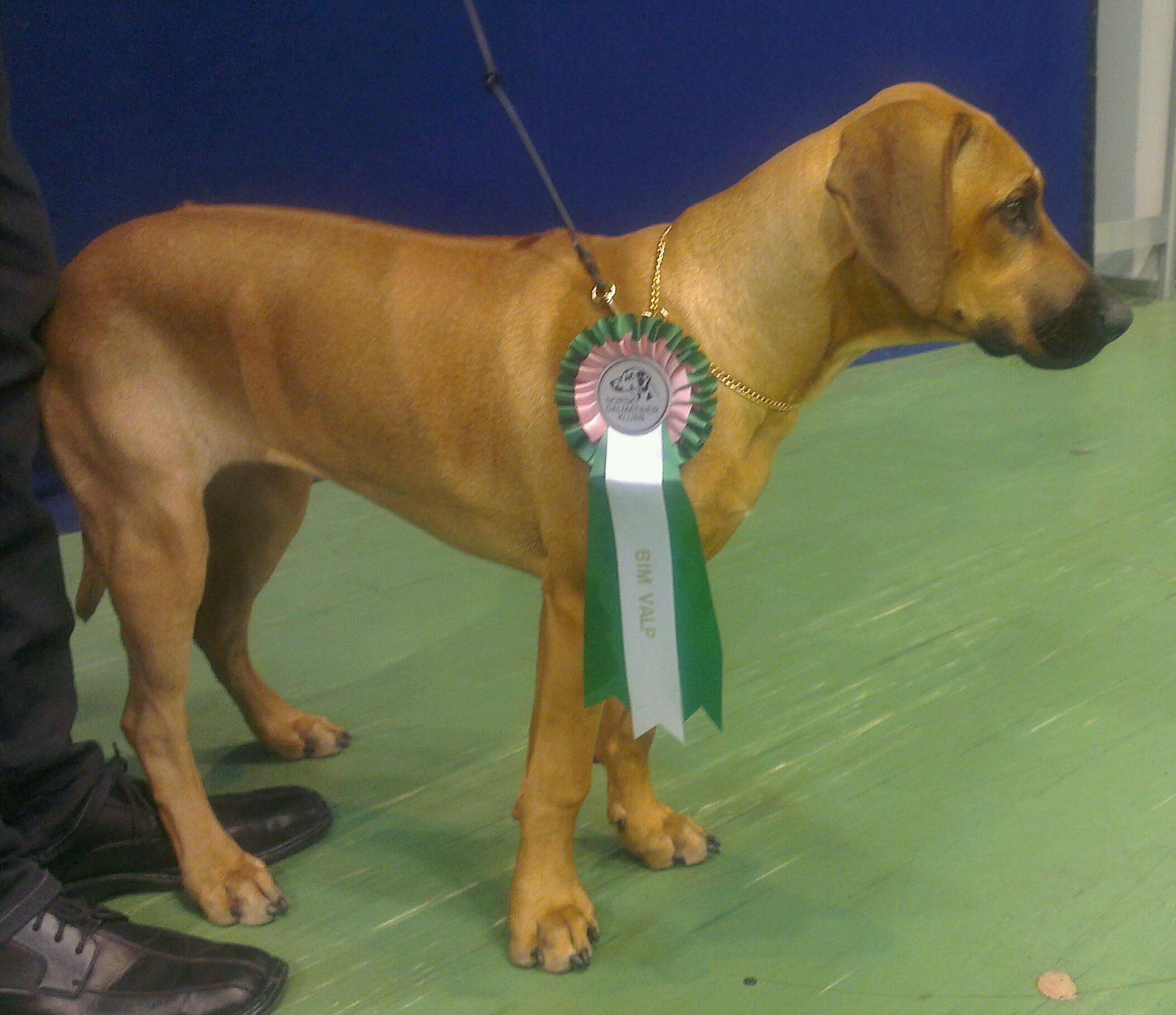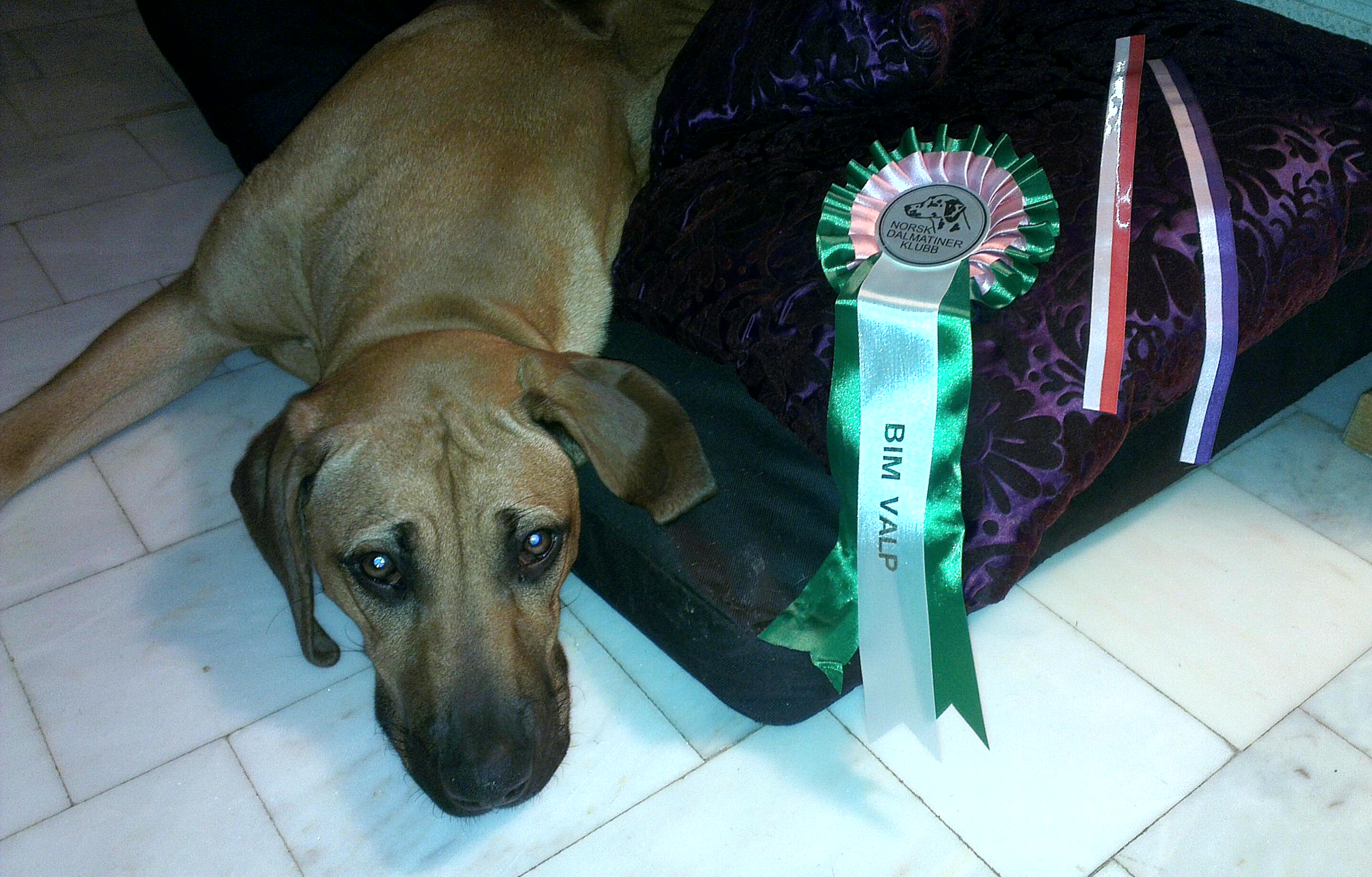 Og så hører jeg hele tiden hvor pen jeg er. Jeg pleier å ikke ta meg så veldig nær av det, annet enn at jeg nyter klapp og kos som følger med rosen. Men matmor skulle plutselig lære meg noe merkelig: stå helt stille, se rett fram, plasser beina litt godt i fra hverandre og se på matmor – klikk – godbit, ferdig… Jeg må til og med trave ved siden av henne i kort bånd. Jeg synes det rett og slett er noen merkelige øvelser og pleier å galloppere litt, og sette meg hvis det blir for kjedelig eller for vanskelig å få godbit.. Så da reiste vi til Leto-hallen. Matmor trodde jeg skulle galloppere hele tiden og sette meg så fort vi sto stille. Sikkert derfor hun ikke var nervøs. Jeg skjerpet meg skikkelig, så da ble det jammen meg bånd i fine farger (lilla/rosa og rød/rosa) og BIM-sløyfe (Rosa/grønn og hvit). Men så var jeg skikkelig sliten når vi kom hjem også. Jeg er overbevist om at det var 10.000 hunder i den lille hallen samtidig. Heeeeerlig!!