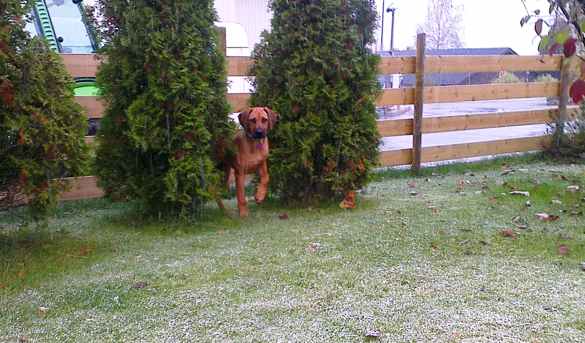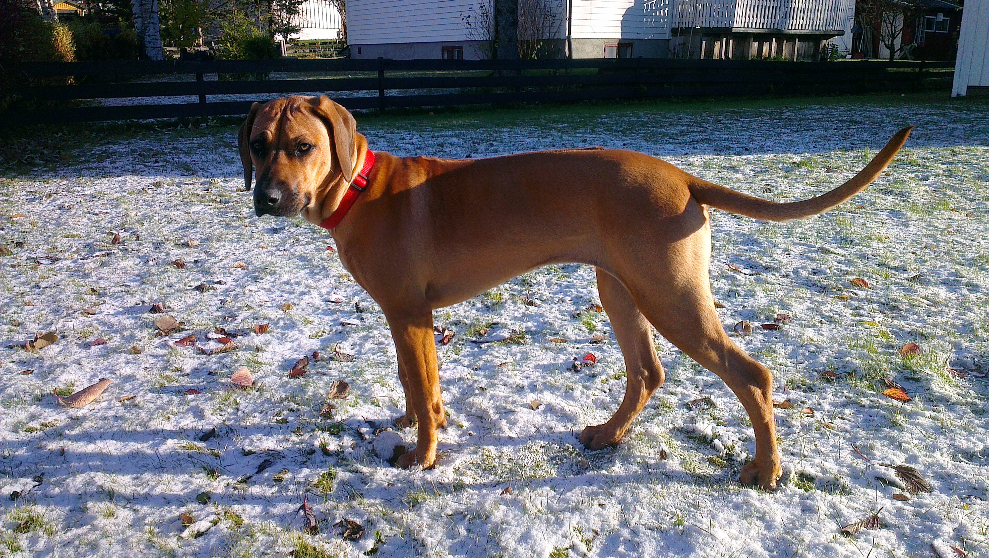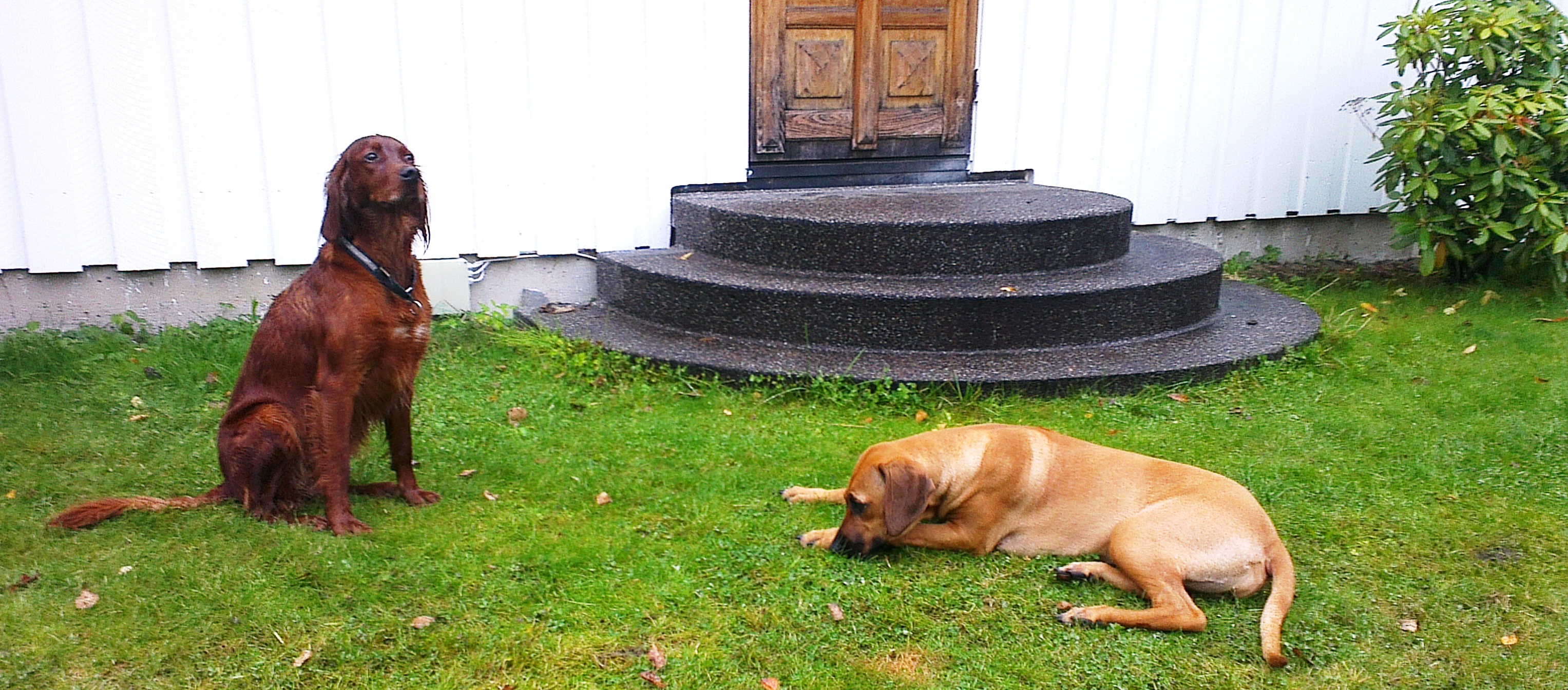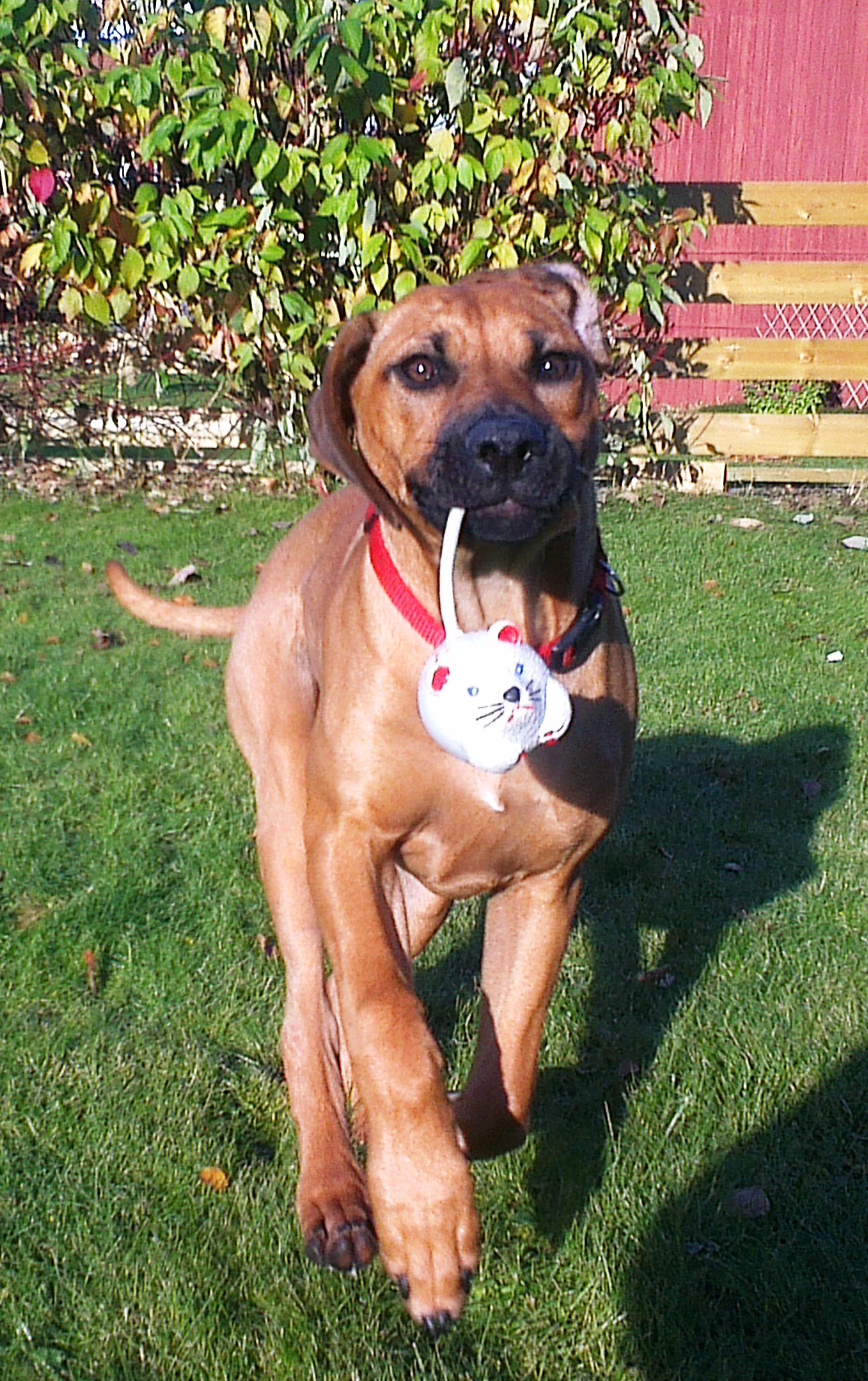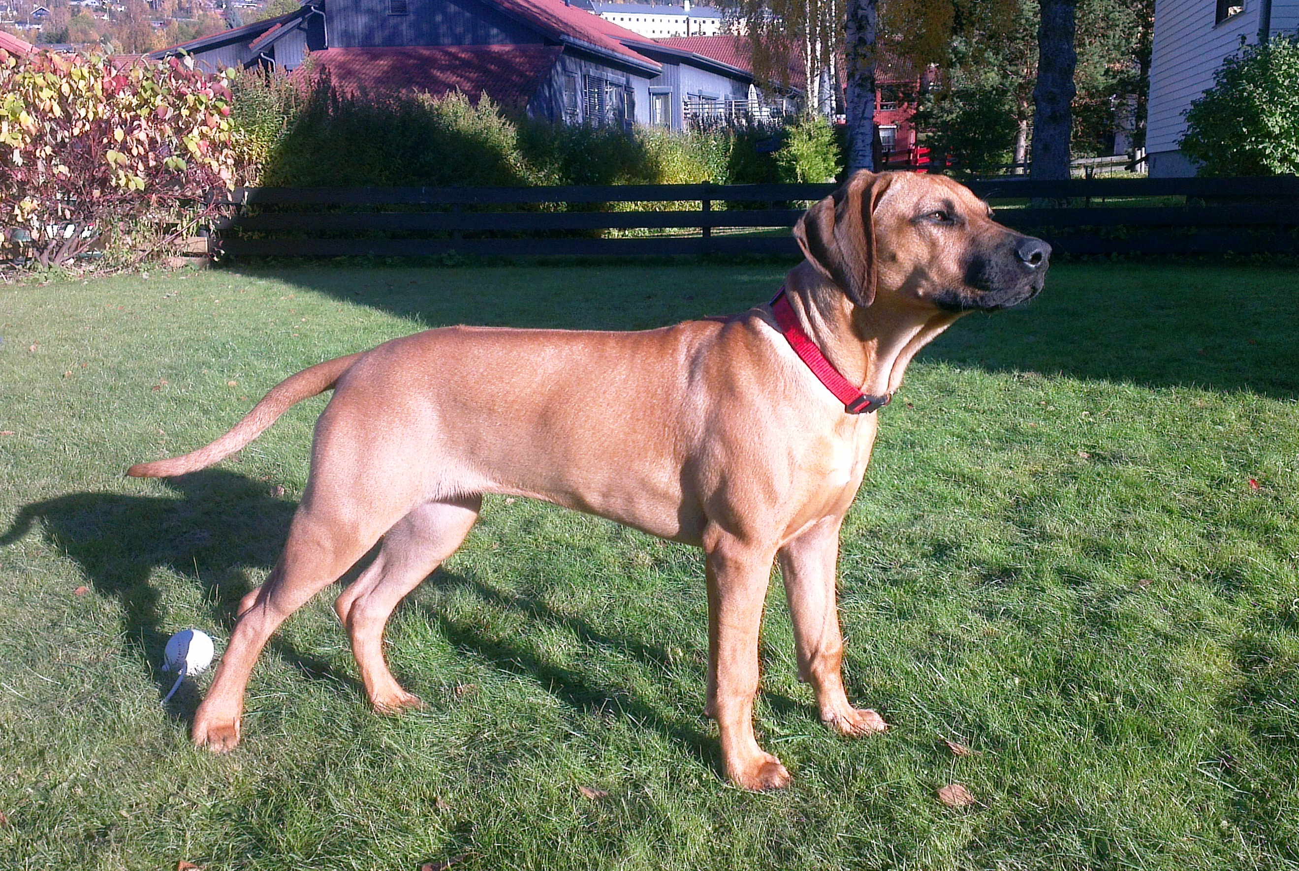 Ellers er jeg skikkelig frustrert på den kjedelige Border Collien, Pus, nabobikkja. Han bare står og piper, men tørr ikke leke med meg. En dag skal jeg hoppe over og leke med han, så da, så… Fram til da får jeg leke litt alene og nyte den store fine hagen min.