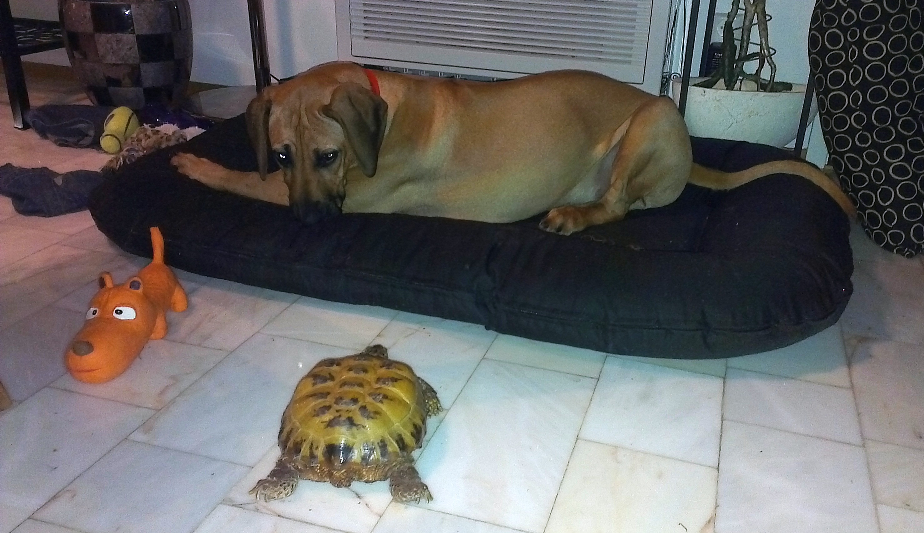 Og  med matfar koser jeg meg ihjel. Han liker å leke med meg nesten like mye som jeg liker å leke med han, tror jeg.. Og de deilige ungene som kommer på besøk er digg. De skjemmer meg ikke bort noe særlig. Alt jeg trenger å gjøre er sitt-, tommel- og kysse-triksene så ramler det inn godbiter. Det er bare den merkelige skilpadden, Greco, jeg ikke skjønner meg på. Hun er jo så klengete, men orker aldri leke med meg. Litt over middels ivrig på lekene mine også, men leke vil hun ikke!