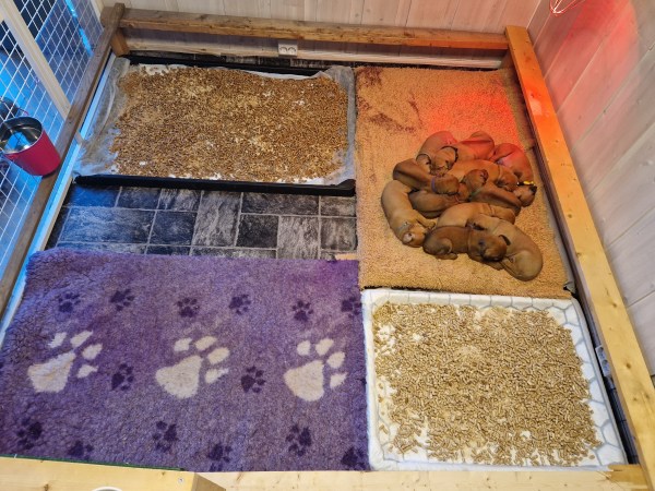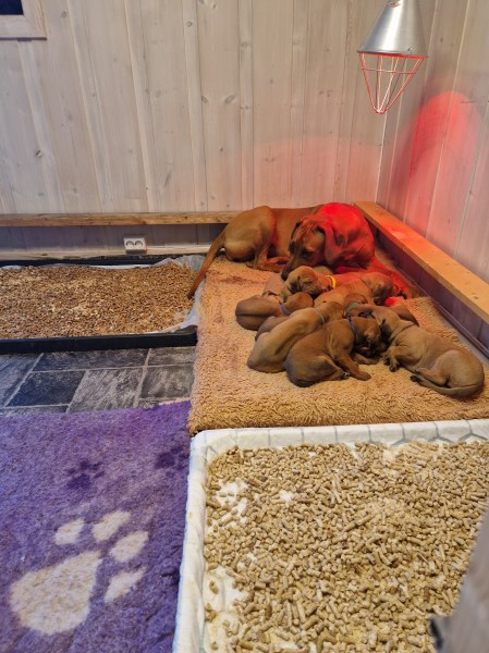 Igår kveld kl.21 fikk valpene sin første valpefôrsuppe og renslighetstreningen var dermed også igang (dag 23) Jeg løftet valpene fra måltid, søvn og lek 39 ganger til sammen opp i tissekassen før vi «voksne gikk og la oss» 🥰💪🥵 I løpet av natten, med foring kun fra valpemor, var det to som hadde tisset utenfor kassen, en hadde tisset «i sengen» og resten hadde tisset i pelletskassene. Etter suppefrokost ble alle løftet opp i kassa igjen, én og én, som trening og hyggelig påminnelse. Den neste perioden blir hektiske løft-valpen-opp-i-tissekassa-døgn, men det er verdt det for å levere helt renslige valper i september.