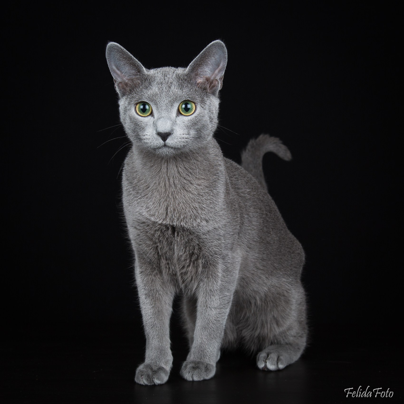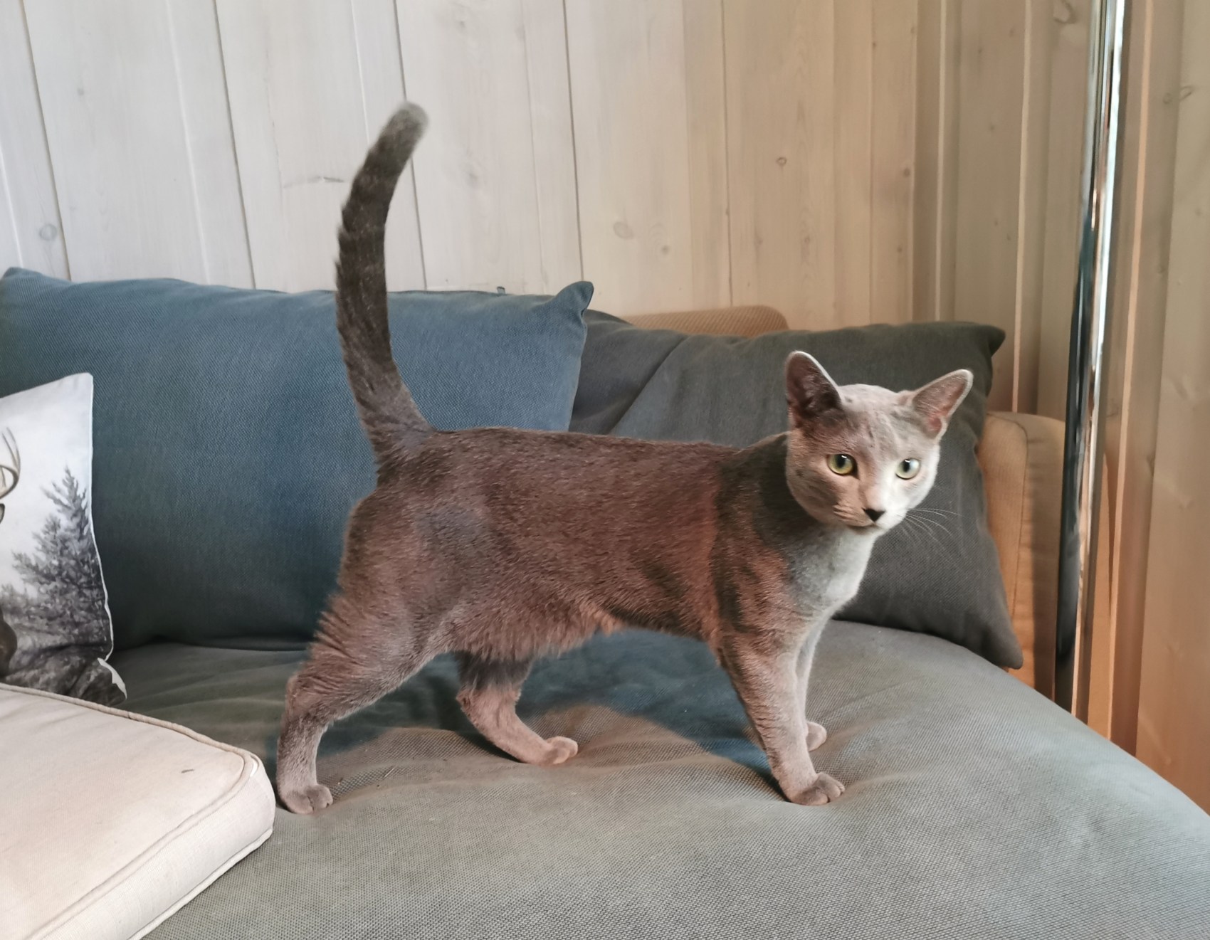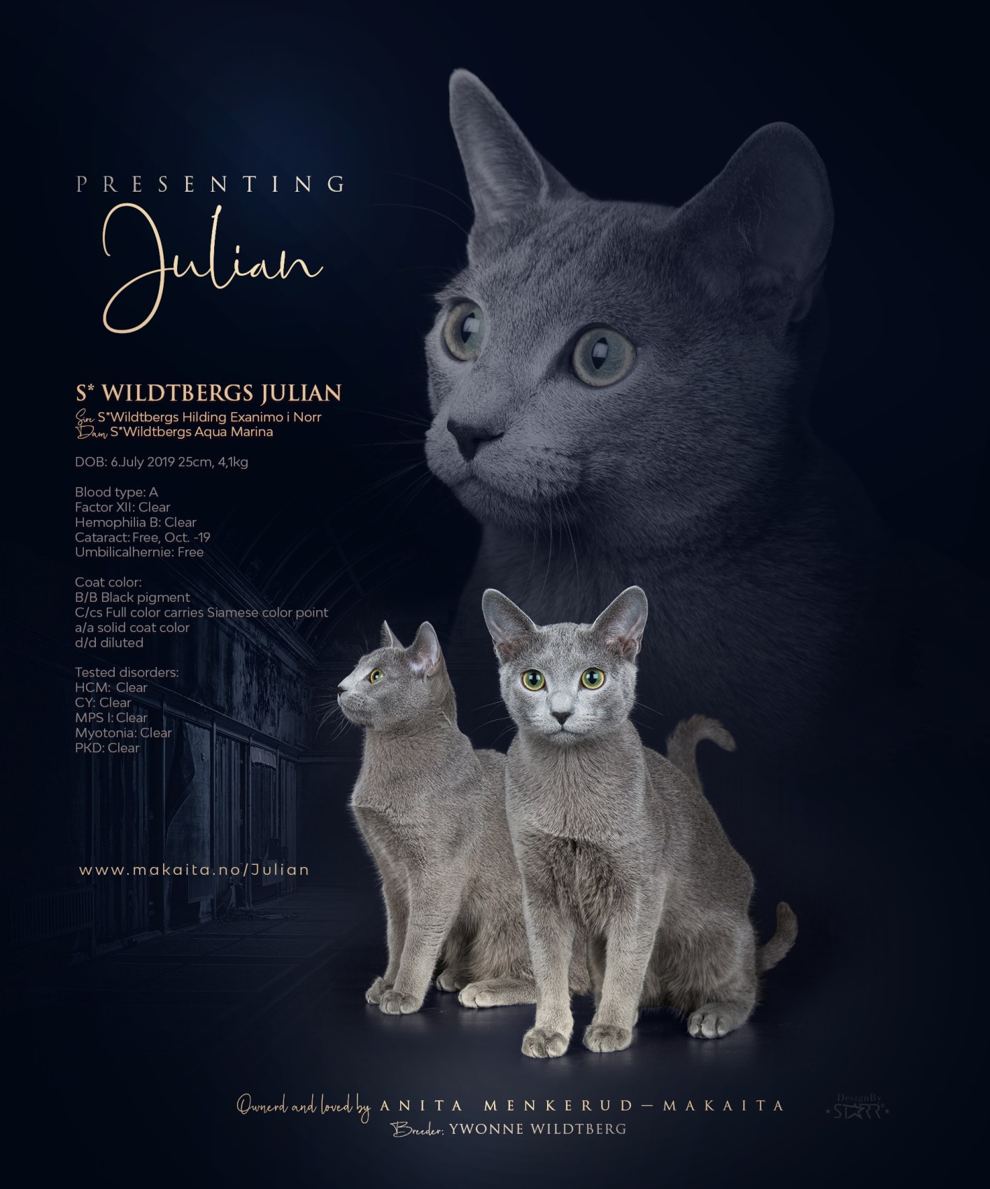 Julian er en flott rasetypisk skandinavisk Russian Blue, utrolig sosial, vokal og med super pels, middels grønne øyne og sterk vilje.